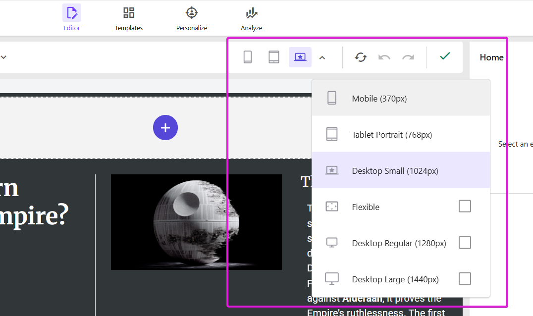 Establishing a standard set of device options (such as desktop, tablet, and mobile) helps enforce a design framework and prevents confusion caused by authors selecting settings at random.