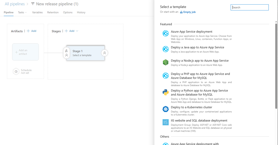 This screen sets off the process to setup the initial Stage of the new release pipeline. Right at the top of the “Select Template” modal, choose “Or start with an Empty Job”.
