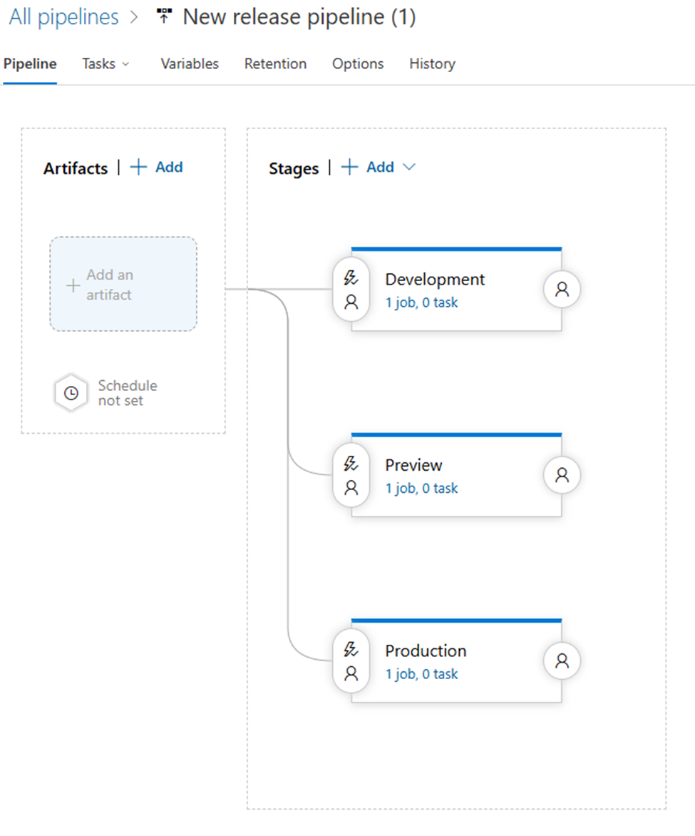 Start by clicking the “+ New” button and select the “+ New release pipeline” option.