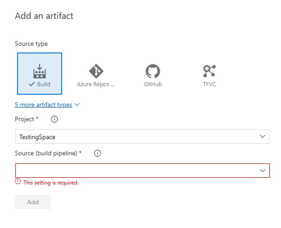 The source type should be set to “Build”, the Project set to the Target project. In this case the same project this pipeline is being created, and the Source should be the Pipeline that creates the build artifact.