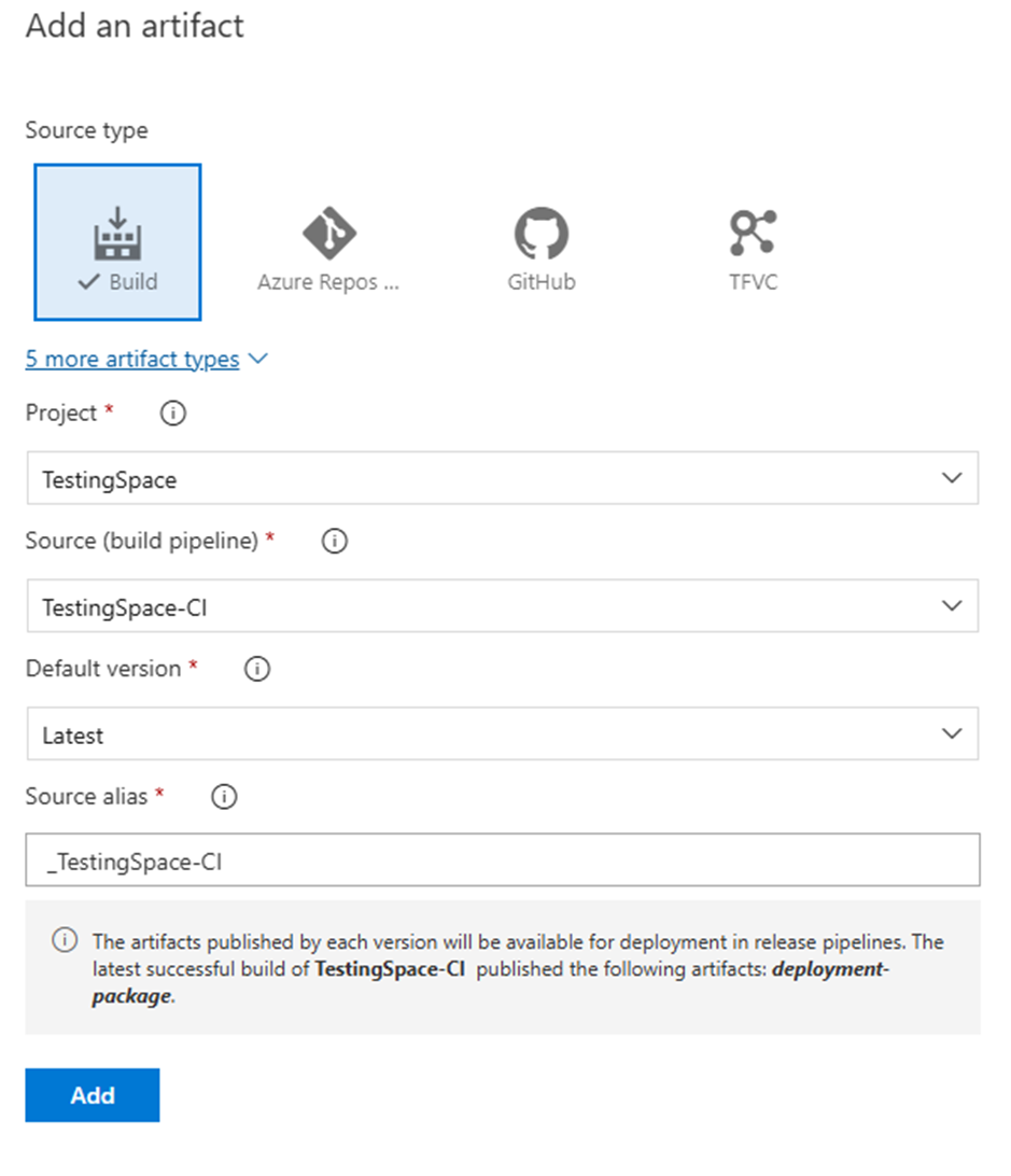 This will bring up the “Add an artifact” wizard to the right of the screen. In this example, it is focused on ADO Builds to Release Pipeline only, there are many other options to pull in artifacts into this process.