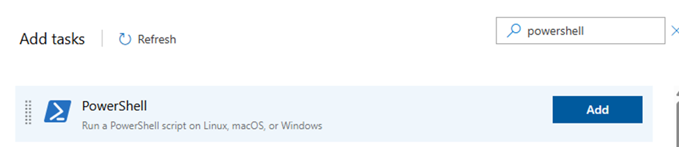 Under Add tasks, search for “Powershell” and add the first one.
