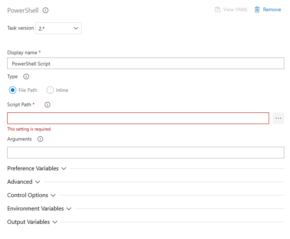 The variables referenced within this PowerShell Script are all setup in the Release pipeline and will be covered within Step 4.5 Set the properties of each Stage.