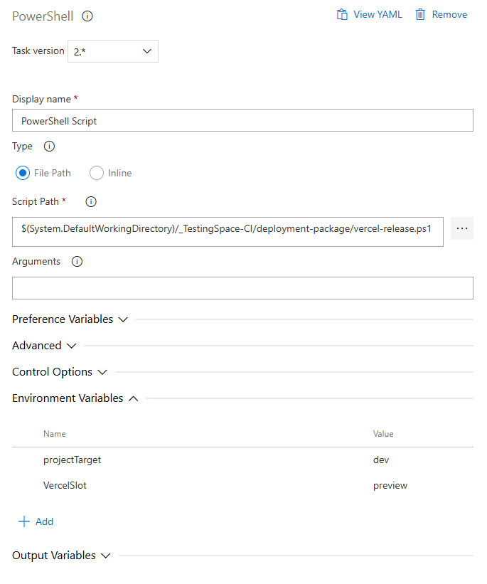 Next expand Environment Variables, this is where you’ll set the general Vercel variables to point to your team and the API token to access it. You will also define the project target (referencing the directory with the project specific settings, eg. dev-vercel), and set the deployment slot for vercel.